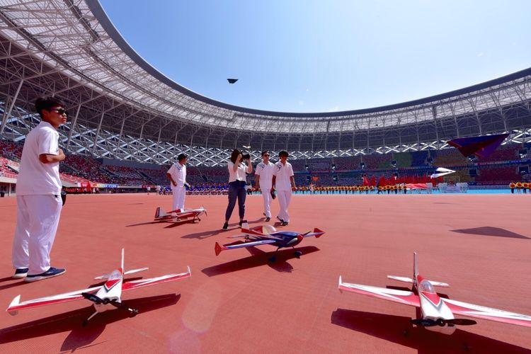 九架3D飛機(jī)、遙控飛機(jī)盤旋在會場上空,精彩的航模表演贏得了學(xué)生們的陣陣歡呼